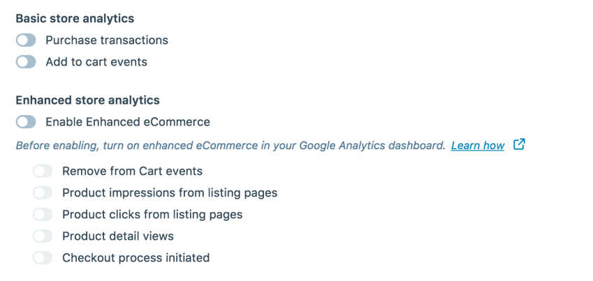 - Return to Jetpack and visit Settings > Traffic. Toggle the settings below the Google Analytics label on or off to track (or not track) features like add to cart events, product impressions, and the checkout process.