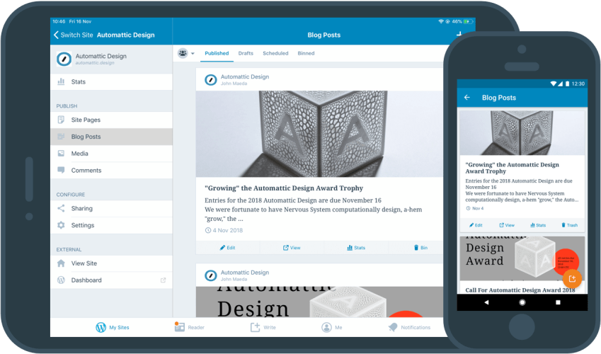 The WordPress mobile apps allow you to collaborate with your team, engage with your audience, and keep an eye on your site at all times. Upload photos directly from your device’s camera, instantly check any notification that comes in, and update any plugin or theme with a simple tap on your device. Manage your site faster and easier, wherever you are.