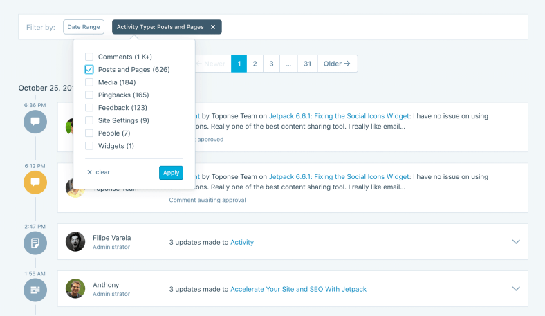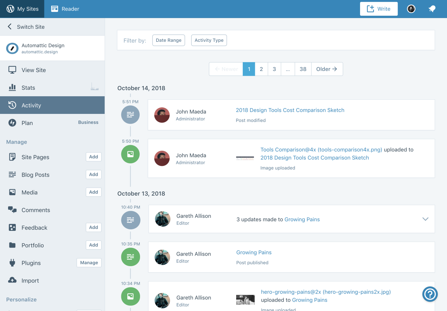 When you try out Activity, you’ll find the 20 most recent events that took place on your site. If you have a Personal or Premium plan, you’ll have access to 30 days’ worth of events. Customers on the Professional plan will have access to a full year of events. Paid customers can also filter activities by type and date range to find exactly what you want in less time.