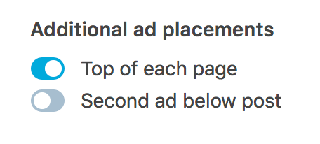 To place ads in the header of your site, or to add a second one near the bottom of your posts, scroll down to Additional Ad Placements, then toggle on the options you want to try.