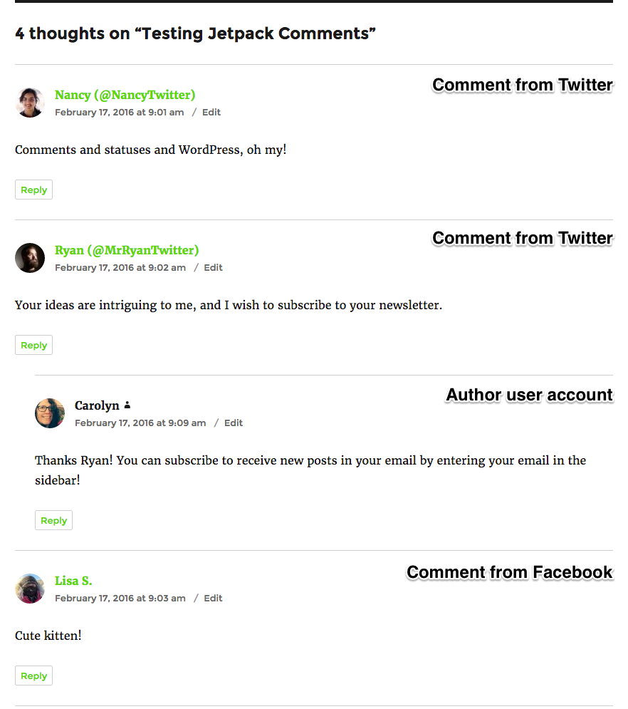 Plus, unlike other plugins that let readers comment with their social media accounts, Jetpack Comments seamlessly display inline with each other to keep your site’s comments from feeling cluttered — and Jetpack Comments use your theme’s style to keep things consistent with your overall look.