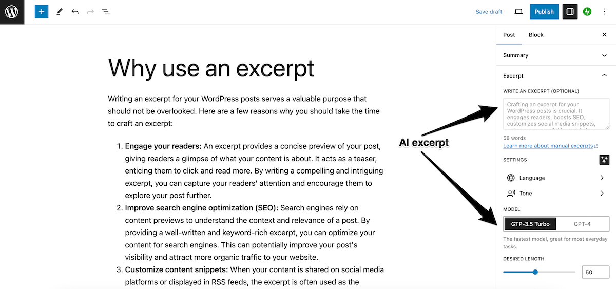 We’ve added a new feature that lets you generate excerpts for your content using AI. This helps you write effective summaries that are engaging and intriguing, resulting in more click-throughs to the full post.