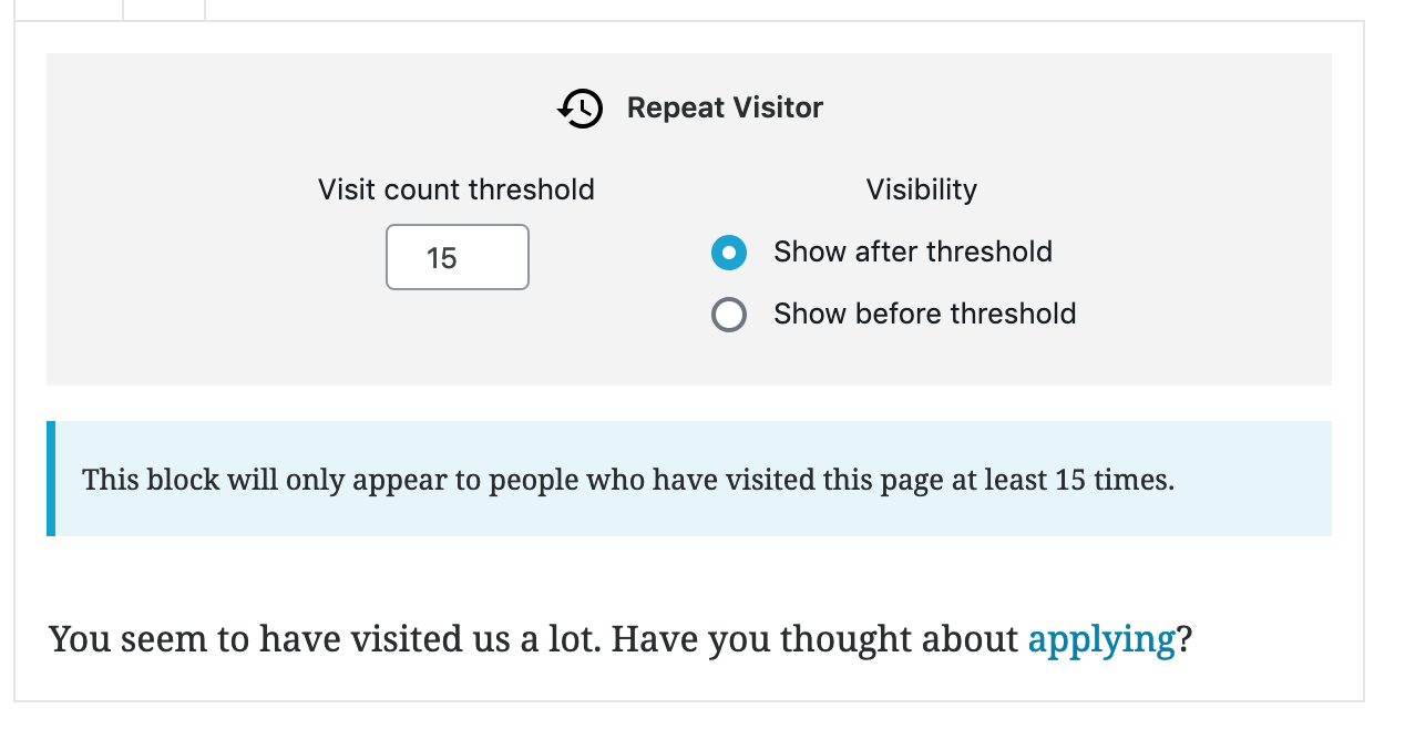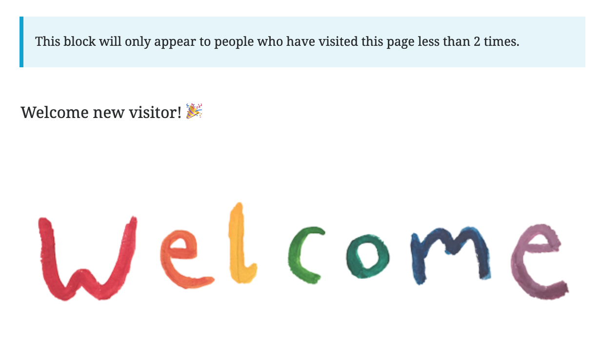 New in the WordPress block editor is Jetpack’s Repeat Visitor block. Use it to display specific content only to visitors who have never visited the page before or only a few times, or only display a targeted message to folks who have already visited a page a set number of times.