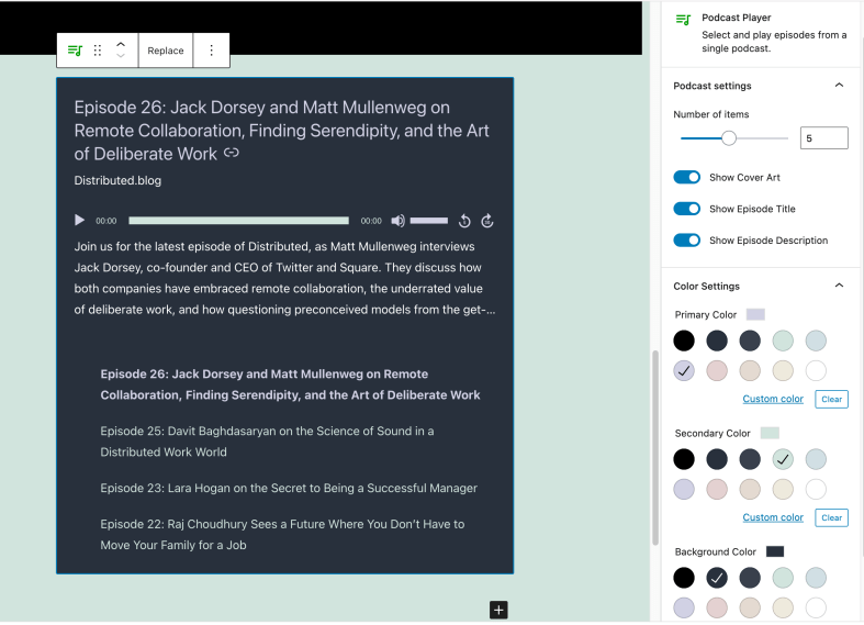 • The Podcast Player Block has skip back and forward buttons, and supports pages with multiple podcasts and RSS feed links.