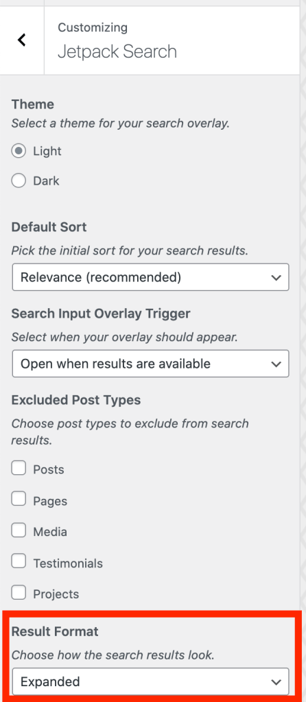 With the release of 9.5, Jetpack Search will now display featured images in the search results. In order to display images within Jetpack Search, choose the “Expanded” option under Result Format within your WordPress customizer.
