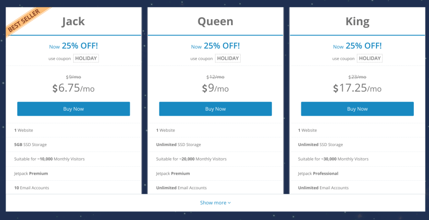The managed WordPress hosting plans from MilesWeb — which come with the royal names of Jack, Queen, and King — include tons of storage space, plenty of email accounts, free SSL certificate. They also have 99.5% uptime and 24/7 support.