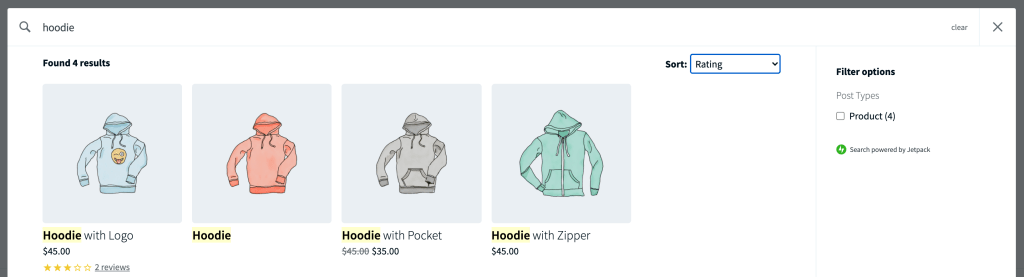 This will be the new default for WooCommerce sites activating a new Jetpack Search subscription. For existing customers, you can enable the new product result format within the Jetpack Search section of your WordPress Customizer. While there, you can also configure Jetpack Search to exclude certain post types, such as pages and posts, from appearing in your search results.
