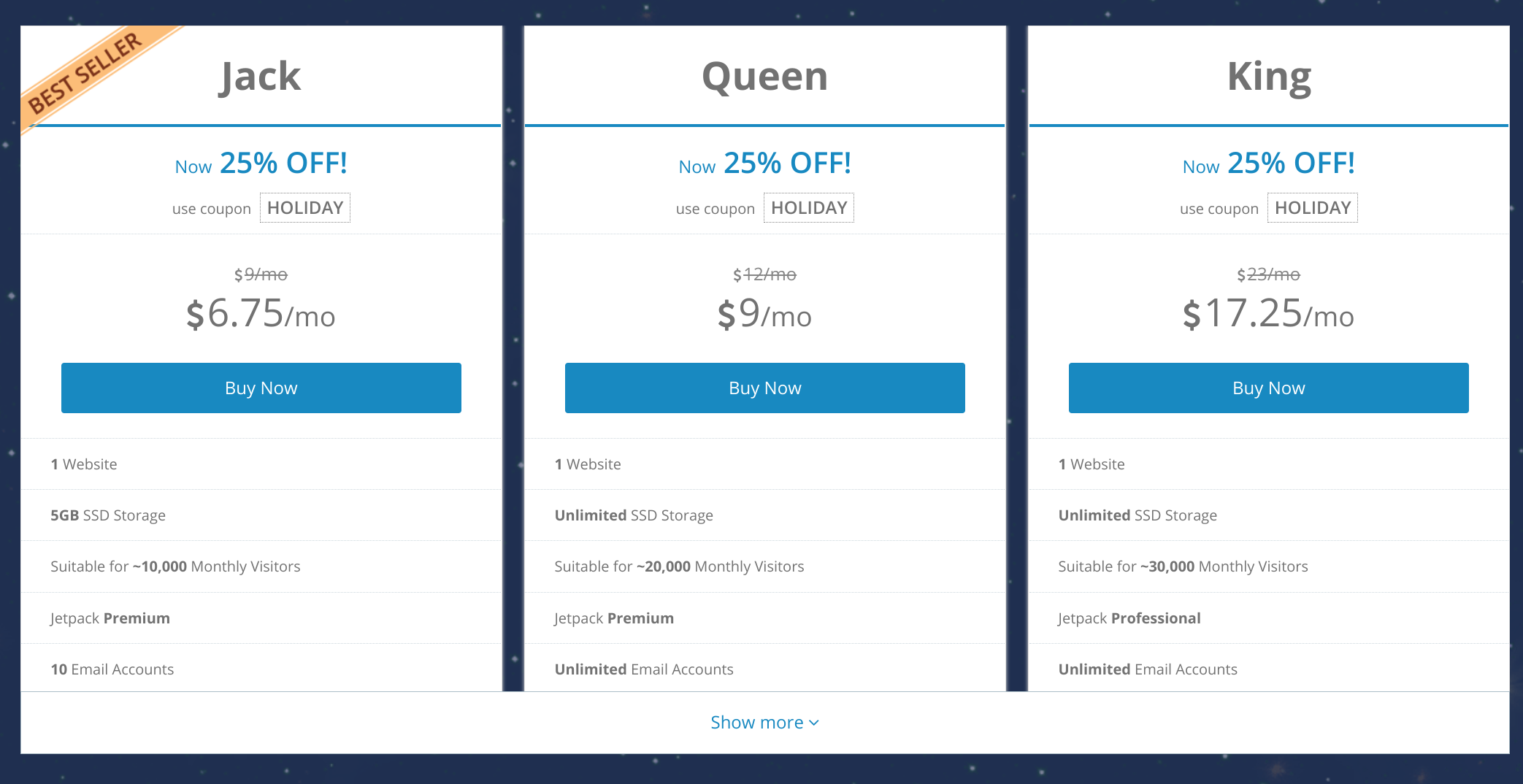 The managed WordPress hosting plans from MilesWeb — which come with the royal names of Jack, Queen, and King — include tons of storage space, plenty of email accounts, free SSL certificate. They also have 99.5% uptime and 24/7 support.