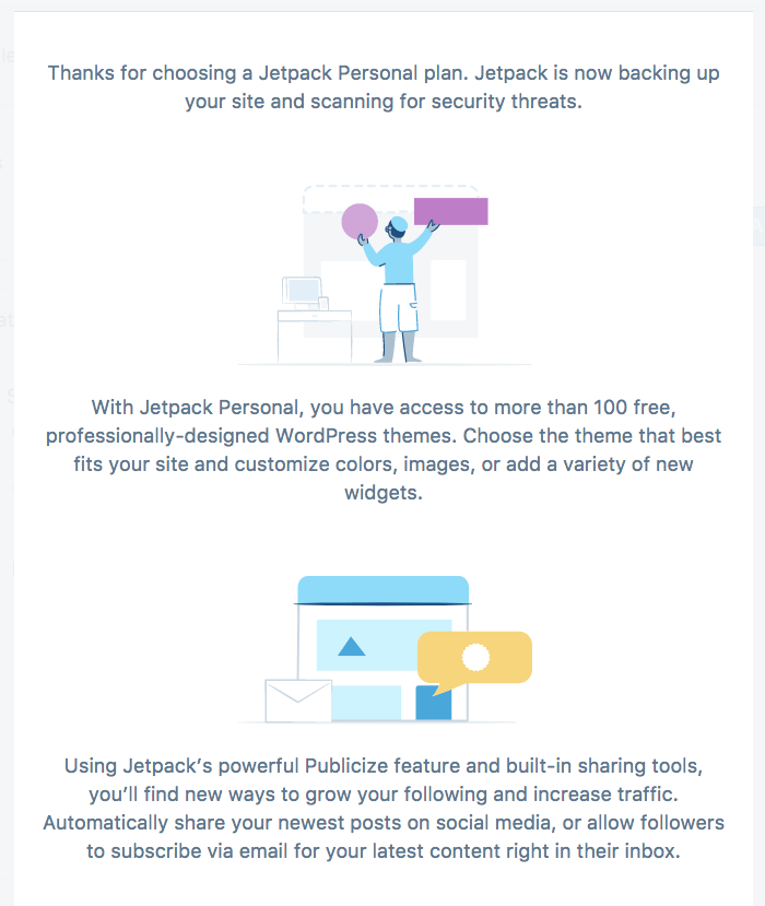 When purchasing a Jetpack Personal, Premium, or Professional plan, you’ll now see a welcome screen with some tips to help you make the most of the plan you just purchased.