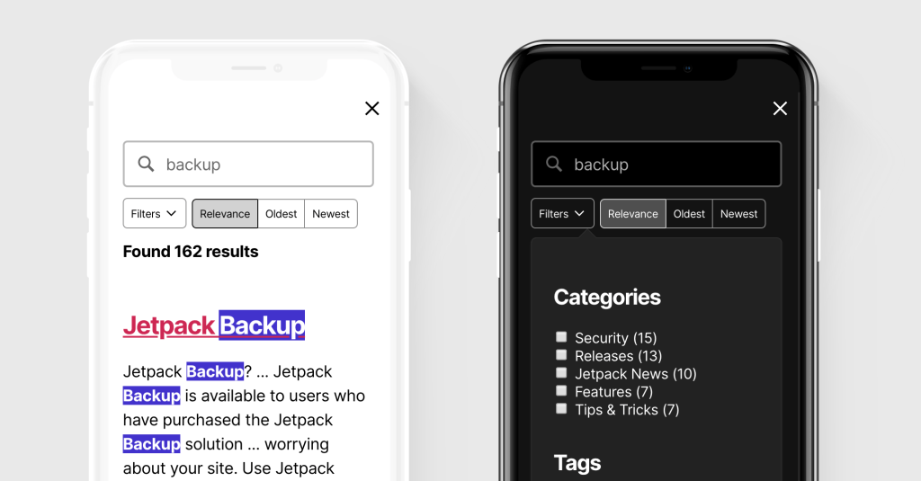 We had filtering and facets in the previous version of Jetpack Search, but only 10% of sites actually configured it, and it didn’t work if the user was on a mobile device or your theme didn’t have a sidebar. Our new overlay UI ensures that we can automatically configure filters for all sites while still letting admins customize the settings, sidebar or no.