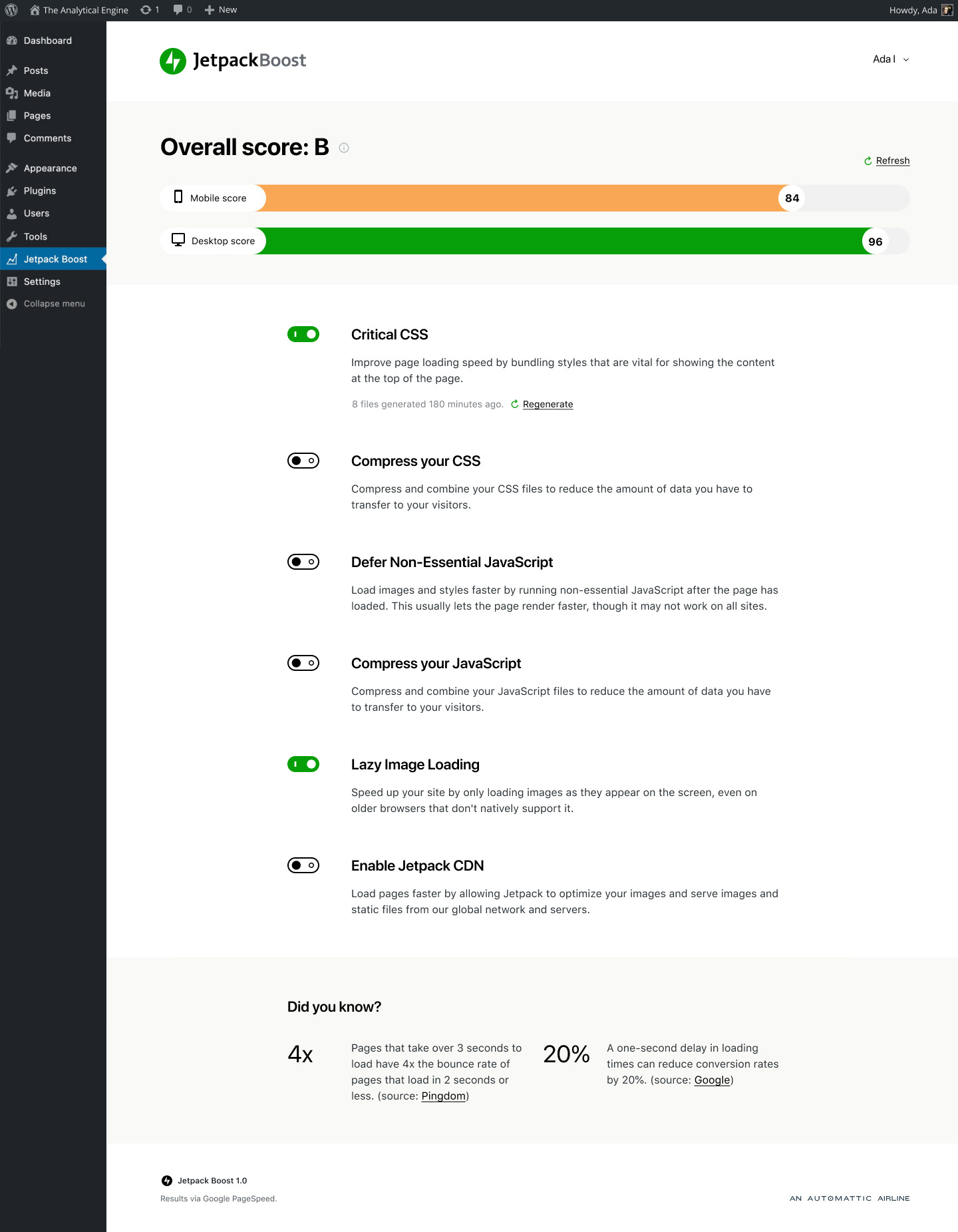 While there are many techniques that can be used to improve site speed and performance, it can be challenging to quickly get to the root of the problem. If you’re at a loss for where to begin, a plugin like Jetpack Boost can identify areas of improvement and automatically resolve many of the major issues affecting your site’s performance.