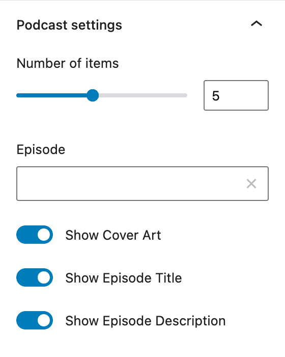 - Number of items: controls how many episodes will be displayed. The latest episode will always display first.