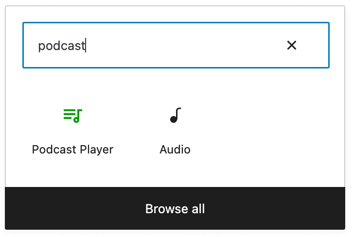 The Podcast Player block is activated by default. It cannot be deactivated; the Podcast Player block is always available in the Block Selector.