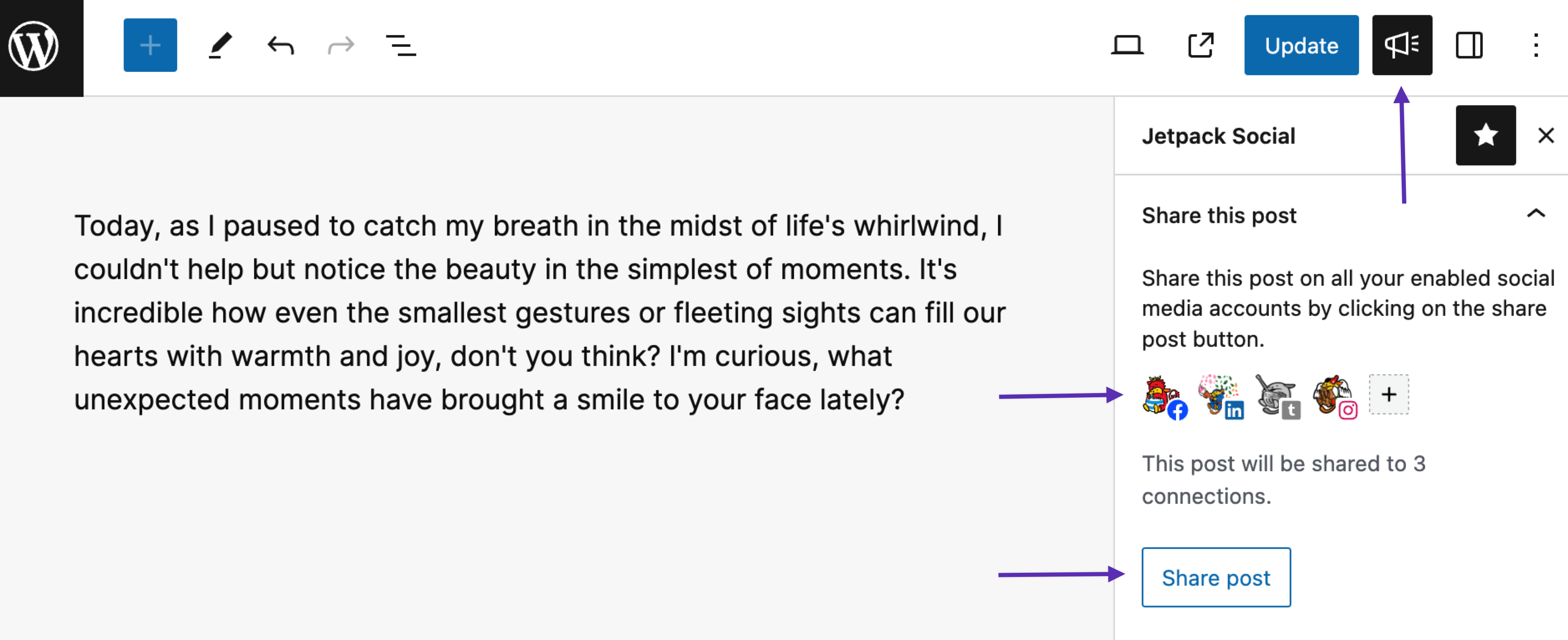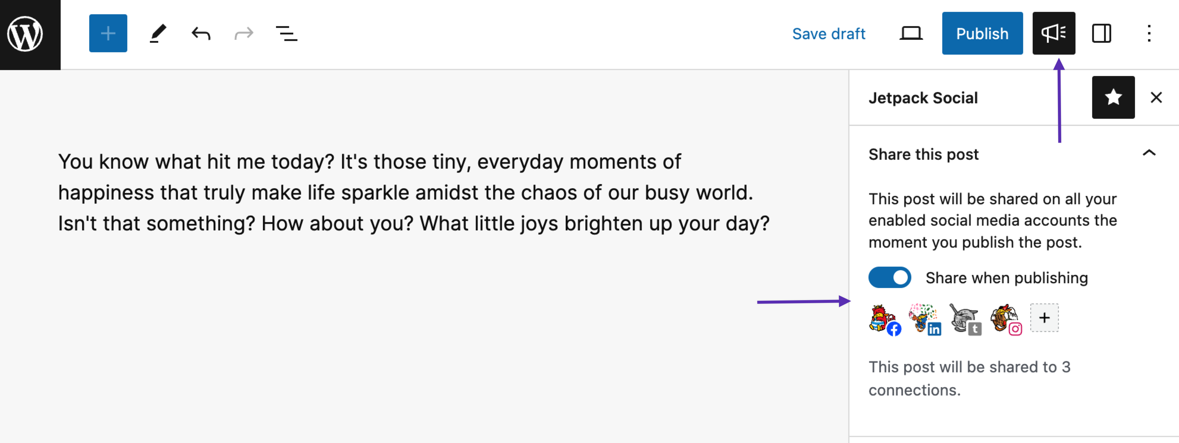 - Click the Jetpack Social icon at the top right to open sharing settings.