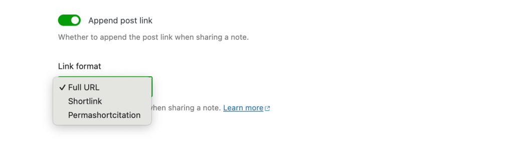 - Full URL: This is the default option. It links directly to your note using the full URL. Example:
