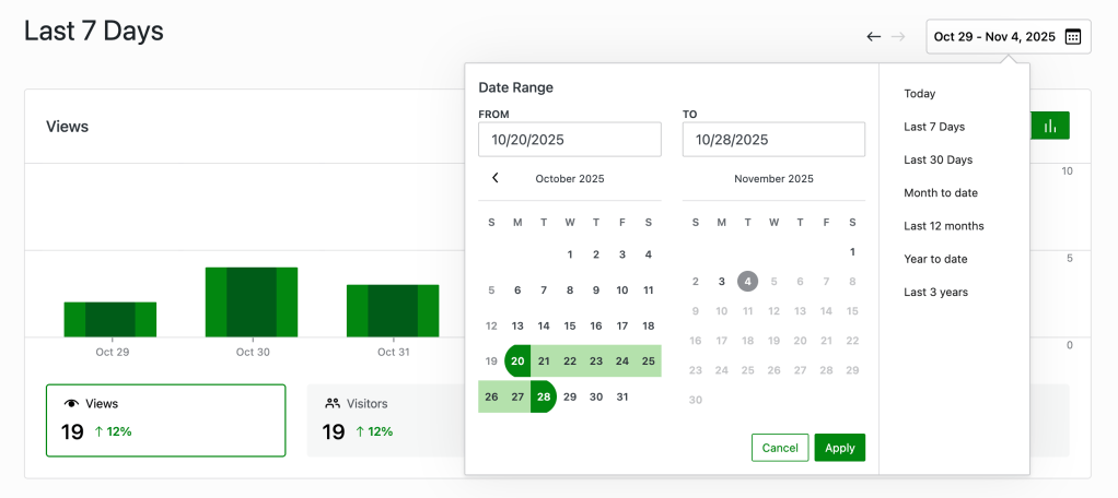 After selecting a custom or relative date range from the date filters above, choose how your data is displayed using the viewing mode dropdown (days, weeks, months, and years) located beneath the date filter.