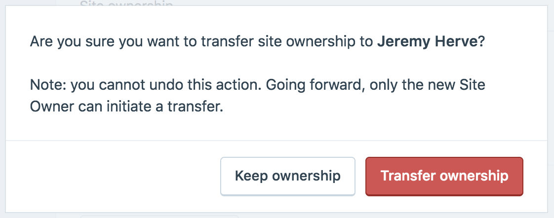 - Select a user to become the new Site owner and click the Transfer ownership button to complete the transfer.